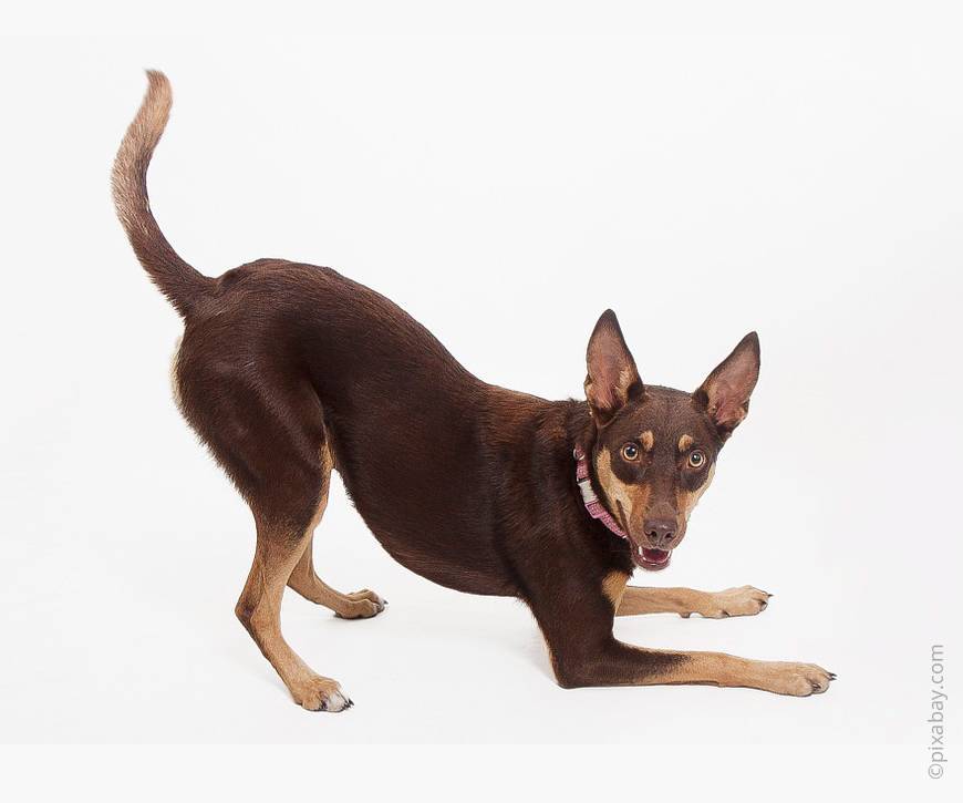 - высоко поднятый напряжённый хвост, виляние кончиком — готовность к действию (схватить игрушку, выполнить команду);