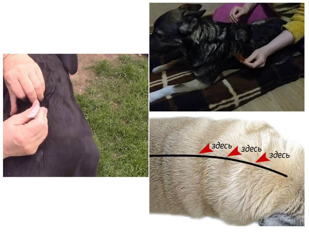 - Соответствующую дозу лекарственного раствора наносят на сухой и неповрежденный кожный покров, аккуратно раздвинув шерсть питомца. Обычно это делают в нескольких местах, где животное не имеет возможности слизать раствор (на холке или между лопатками).