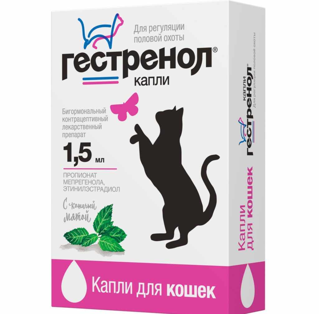 - уменьшить степень влечения или прекратить охоту у котов до 5 кг помогут 4 капли Гестренола в день. Курс – 3-5 дней. Капать начинают при первых признаках беспокойства. При этом для котов более 5 кг дозировка составляет 4-8 капель;