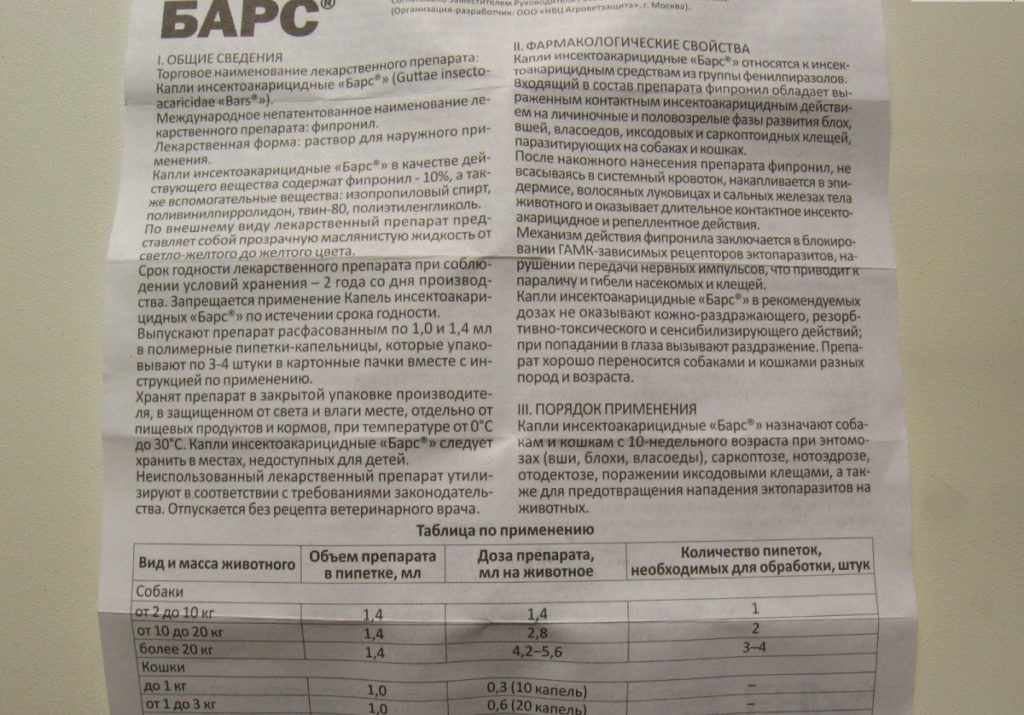 | «Барс» капли против блох и клещей | Фипронил, дифлубензурон, дикарбоксимид | После нанесения вещество всасывается в кожу, не попадает в кровоток, а накапливается в волосяных фолликулах и кожных железах. Действуют капли в течение 1–2 месяцев. | 8 недель |