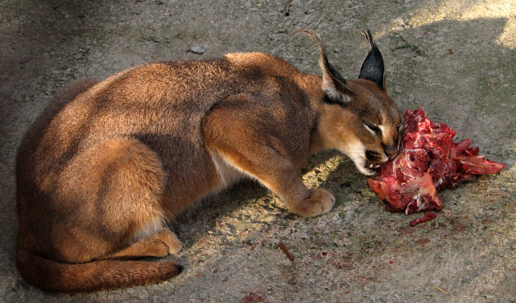Каракал, в отличие от домашних кошечек, 100% хищник. Это учитывается при составлении рациона. В дикой природе степная рысь питается грызунами, птицами, зайцами и даже маленькими антилопами. Конечно, в домашних условиях вы не наловите питомцу мышей и птиц. Как сделать питание сбалансированным?