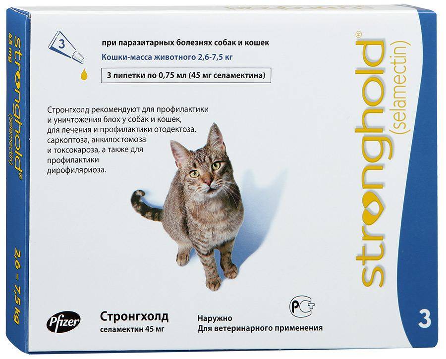 Эффект сохраняется два месяца. Стронгхолд – эффективное средство, помогающее травить блох. Не вызывает побочных реакций, хорошо переносится беременными животными. Наносят на холку, быстро высыхают, в составе нет масел, поэтому он не пачкает шерсть. Действует на протяжении месяца.