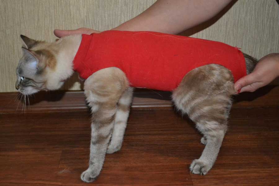 Если шов расположен низко и такой бандаж задирается, можно также сделать прорези для задних лап. Такой комбинезон гораздо эластичней хлопчатобумажной попоны, меньше сковывает движения животного, доставляет гораздо меньший дискомфорт, его проще надевать и снимать при необходимости. Задавшись вопросом, как сделать попону для кошки, можно рассмотреть оба варианта, какой лучше воспримет домашняя любимица.