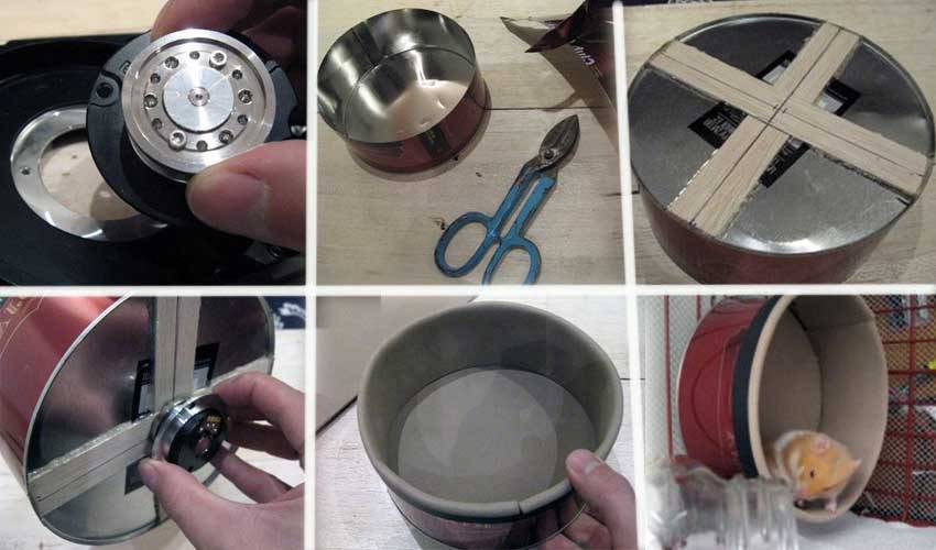 - выбирая в качестве каркаса металлический круг, предусмотрите наличие гладких краев изделия, чтобы предохранить хомяка и себя от возможных порезов. Заниматься резкой жестяной бутылки или иной емкости лучше специальными ножницами, предназначенными для металла;