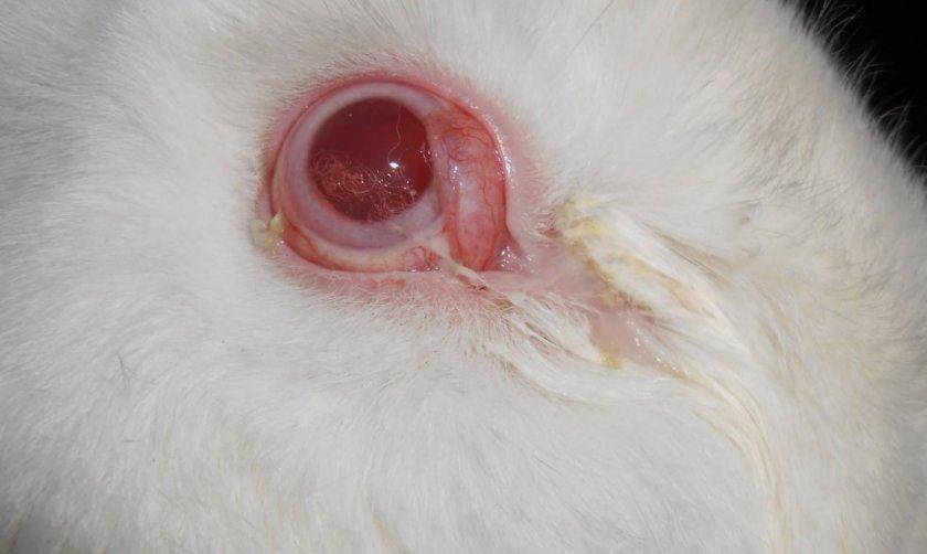 Ещё больше животные страдают от возникших болей в районе глаз. Часто воспалительный процесс переходит на роговицу глаза и внутреннюю поверхность и края век, что можно заметить по образовавшимся язвочкам на них. Это и есть кератит. На более позднем этапе большая часть роговицы становится белой. Это не что иное, как плотный непрозрачный рубец. С образованием помутнения зрение резко ухудшается, а с появлением бельма кролик теряет способность видеть. Часто бельмо бывает «украшено» одной крупной язвой или несколькими поменьше. Но и это ещё не всё, ведь язва — незаживающая рана имеет тенденцию прогрессировать вглубь, что чревато вытеканием глаза.