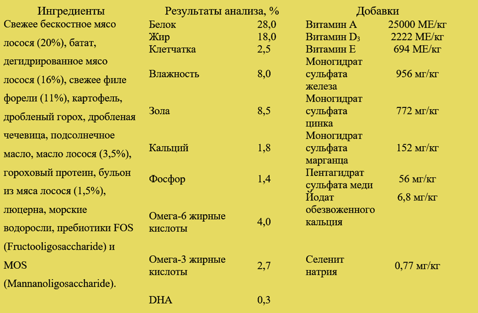 На первое место изготовители поставили свежее филе лосося, которое в процессе приготовления теряет влагу и массу. Рыбная лососевая мука – гипоаллергенный корм. Его преимущество в том, что нет необходимости применять курятину, на которую у отдельных питомцев развивается аллергический ответ. Вторую позицию занимает батат. Его количество, вероятно, более 16%. Это источник медленного крахмала и подсластитель.