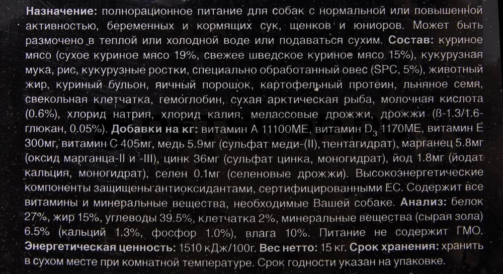 У марки есть сухие гранулы, влажные консервы. Учитываются различия в породах и размерах. Производитель позиционирует продукт как премиум-класс, но состав бюджетный. На первом месте мясная мука, крупы (кукуруза, рис, пшеница). Последнее не полезно для организма.
