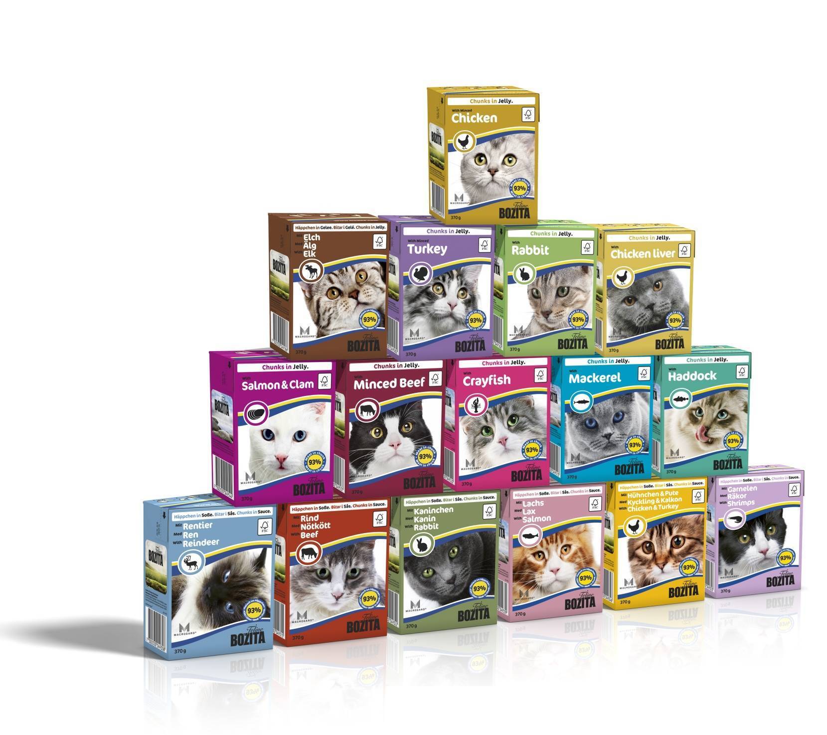 Помимо сухих кормов, Bozita производит в том числе обожаемые многими питомцами влажные. Они выпускаются в форме либо пакетиков по 85 г, либо небольших картонных коробочек по 375 г. Корм является полноценным рационом и может заменять сухой.