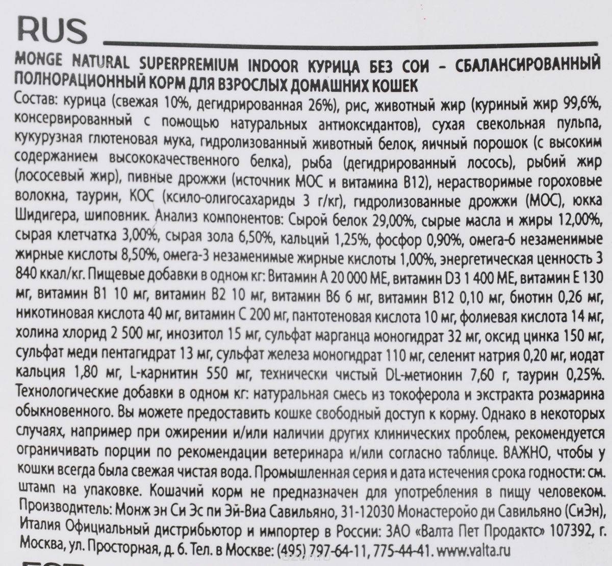 При анализе продукции Монж меня насторожил тот факт, что производитель никогда не употребляет слово «мясо» на упаковках с кормом в разделе о его составе. Это беспокоит многих кошковладельцев, поскольку логично заключить, что при производстве используется не только чистое мясо курицы, например, но и другие её части (кожа, хрящи, субпродукты и пр.).