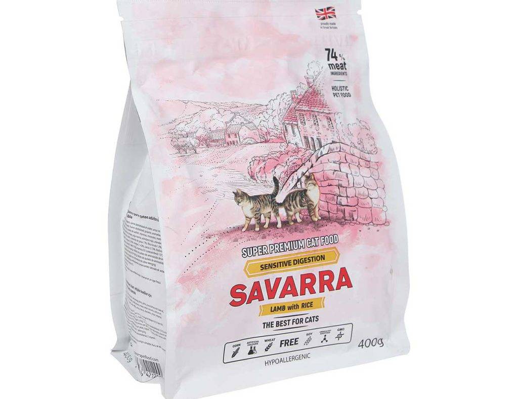- Savarra Sensitive Cat (для взрослых кошек с чувствительным пищеварением). В продукте 74% мясных ингредиентов (основа – мясо ягненка). Ягнятина отличается легкой усвояемостью, низкой калорийностью, малым содержанием жира. Диетическое мясо содержит достаточно питательных веществ, микроэлементов и полный набор необходимых животным аминокислот. Белок мяса ягненка богат селеном, который усиливает иммунную систему.