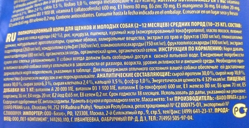 По составу компонентов и содержанию питательных веществ корм для щенков соответствует суперпремиум-классу.