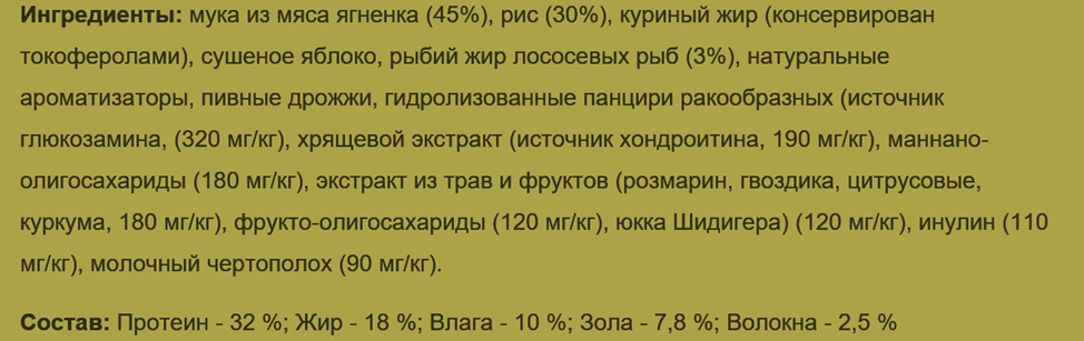 - Мясная мука из баранины (38%) – основной источник животного протеина. В глобальном смысле, отличный ингредиент, но смущает неточность формулировки. Из состава неясно есть ли в муке субпродукты, кости, хрящи.