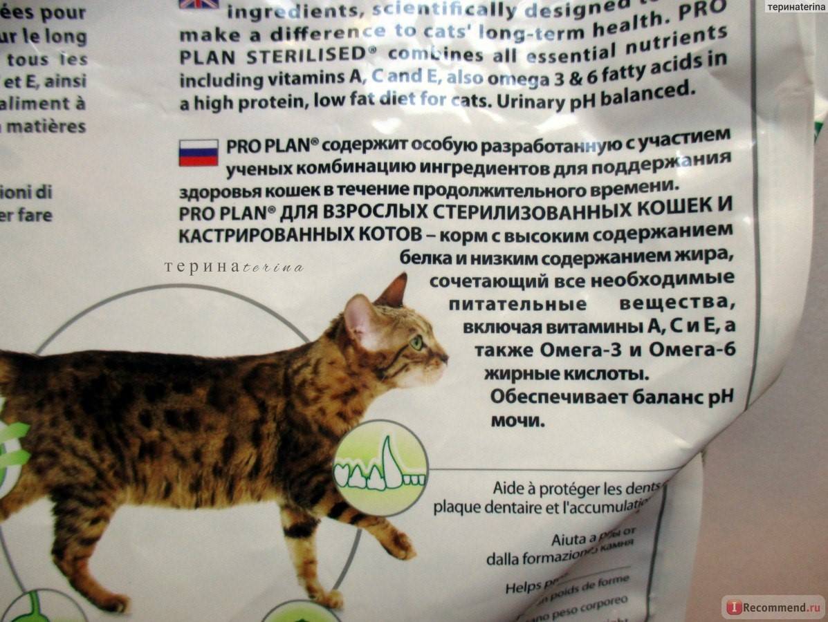 - Pro Plan Sterilised Cat Turkey. В состав входит индейка. Питание обеспечивает правильный баланс рН кошачьей урины, регулирует метаболизм глюкозы.