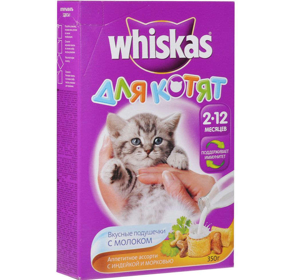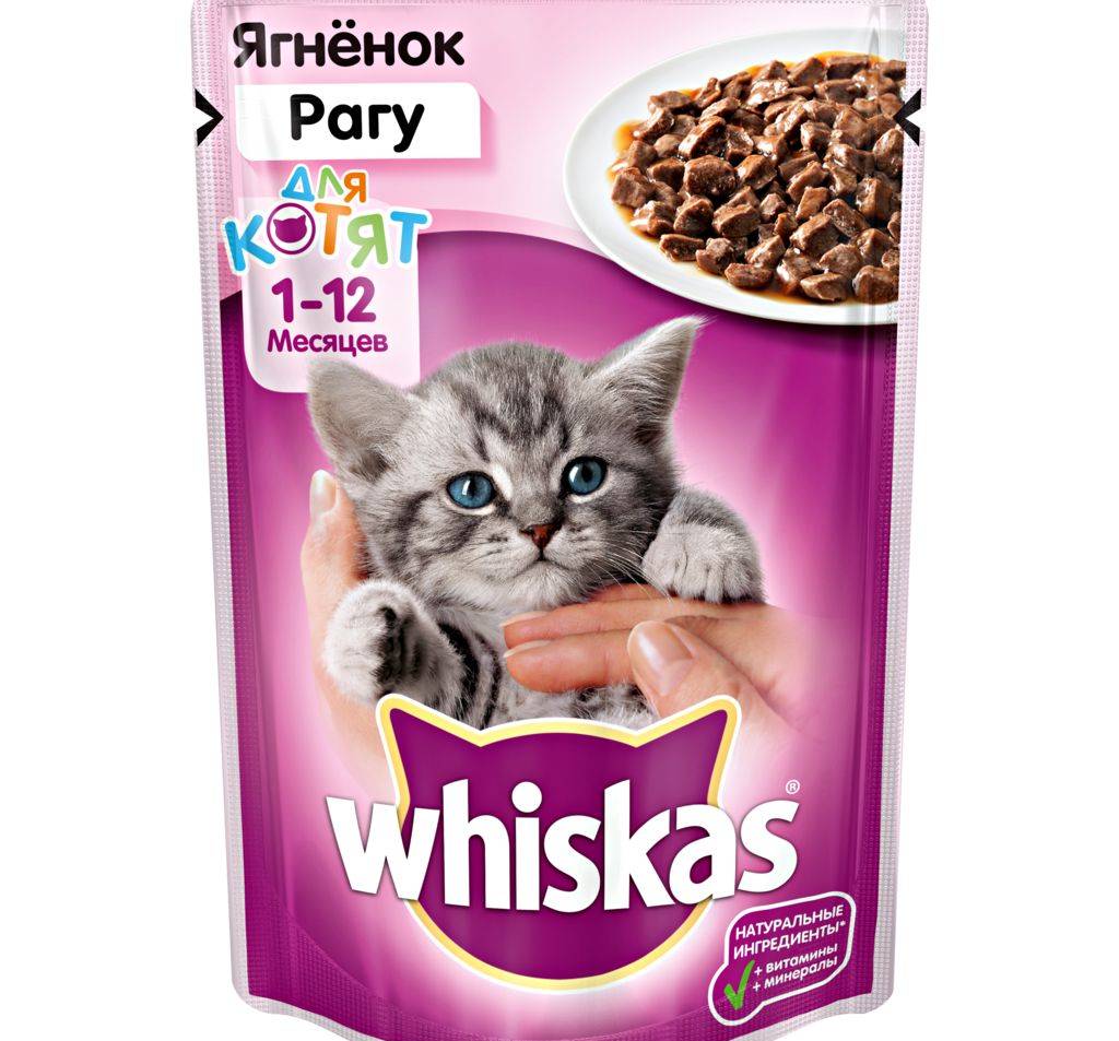 В состав «Whiskas» для маленьких питомцев входят мясные ингредиенты, субпродукты, злаковые культуры, растительное масло, таурин, а также витамины (А, E), минералы (кальций, цинк). Компания «Марс» предлагает для котят сухой и влажный рацион. Сухой продукт производится в виде гранул с индейкой, морковью и молочной начинкой. Влажные корма для маленьких питомцев представлены в следующих вариантах: