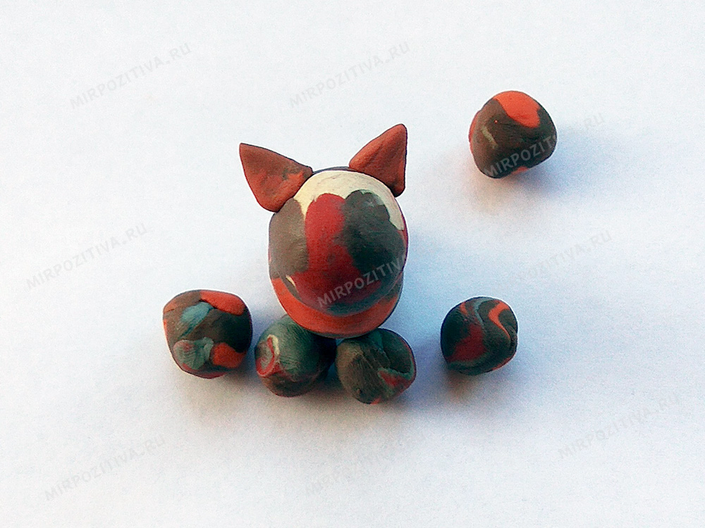 Следующие четыре желтых шарика — будущие лапы и 16 розовых маленьких шариков из пластилина — подушечки на лапах. Из оранжевого шарика получится хвост.