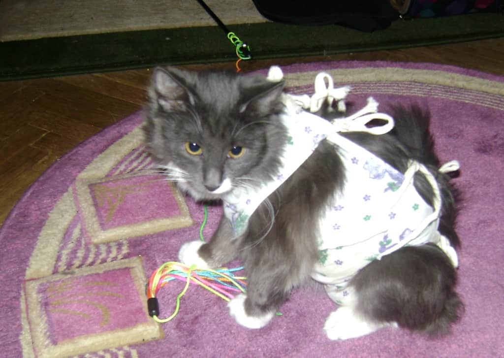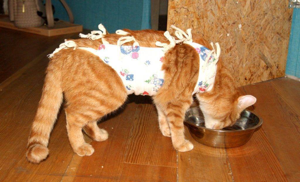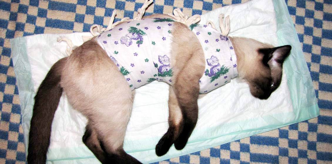 - Чтобы животное не трогало место операции, наденьте специальный памперс.