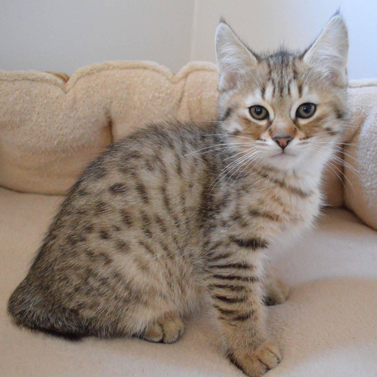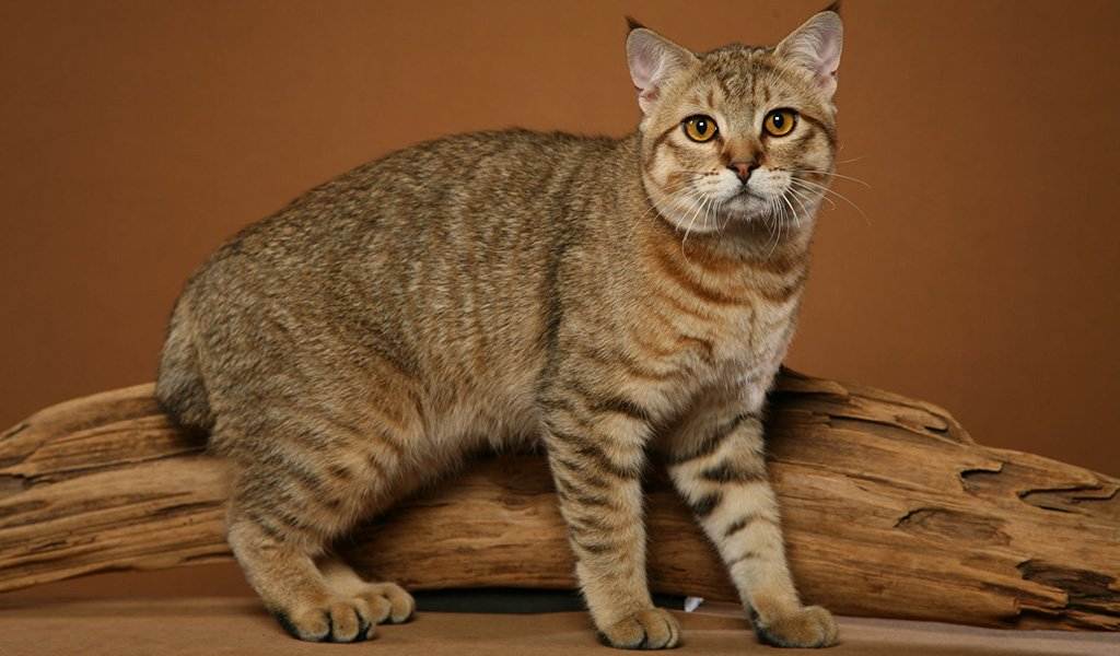 - Окрас у мини-рысей может быть коричневым, рыжим или серым. По всему телу кошек разбросаны пятнышки и полосы, имеющие более темный оттенок, чем основной окрас. На животе, груди и внутренней стороне лап шерсть немного светлее, чем на спине.