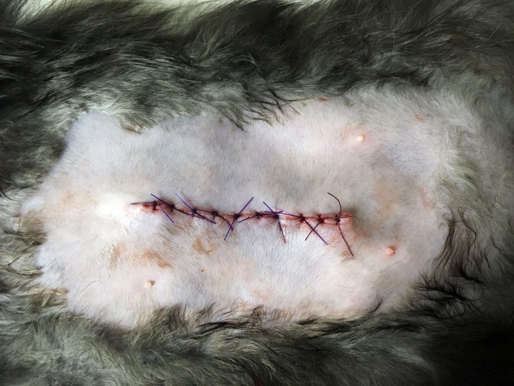 Обычно восстановление длится 10–14 дней. В течение этого срока нельзя мочить место операции. Под конец этого периода ветеринарный врач назначает повторный визит в клинику для снятия швов, но эта процедура не требуется, если разрез скреплен рассасывающимися швами или специальным клеем.