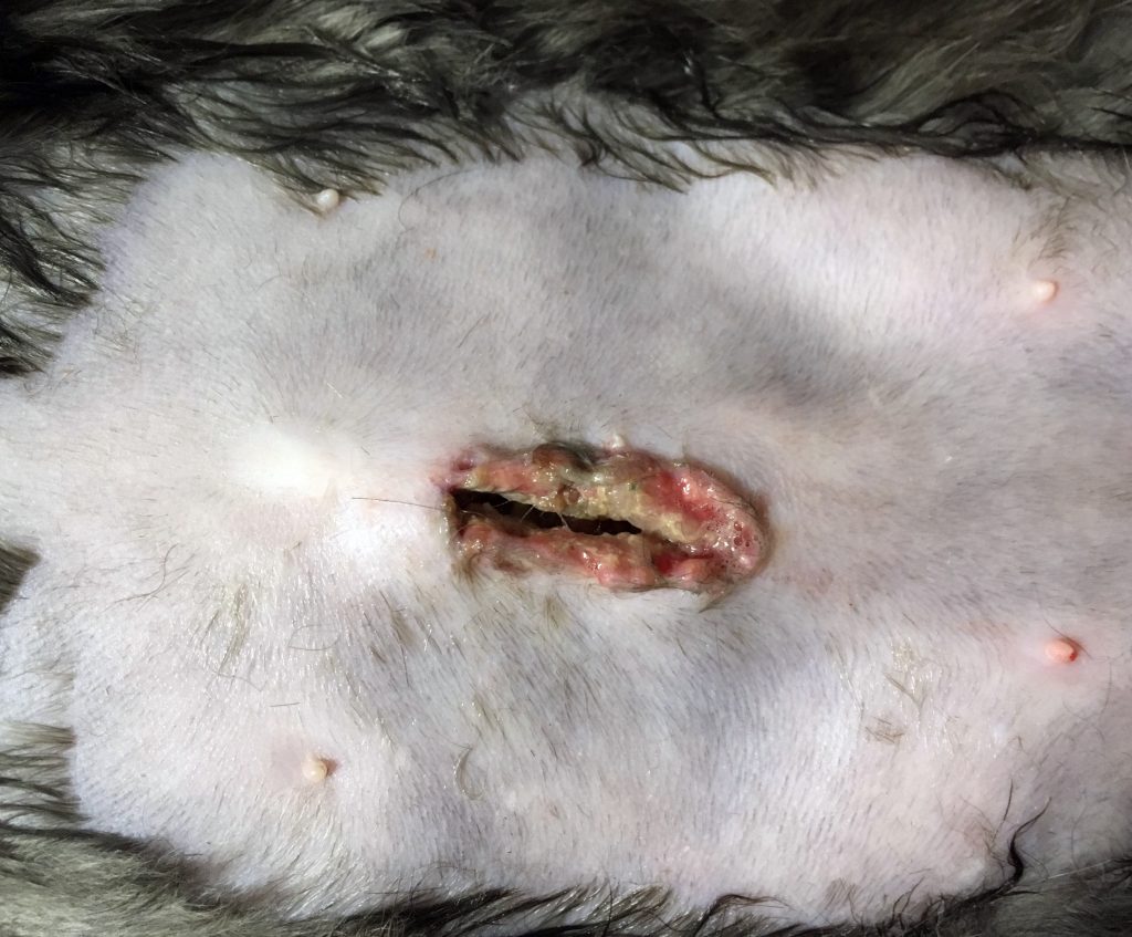 Вместе со слюной в ранку попадает инфекция, и возникает сильное воспаление (загноение) шва. В этом случае никакие нитки уже не удержат ткани вместе. К тому же своим шершавым языком кошка может избавиться от швов раньше времени.