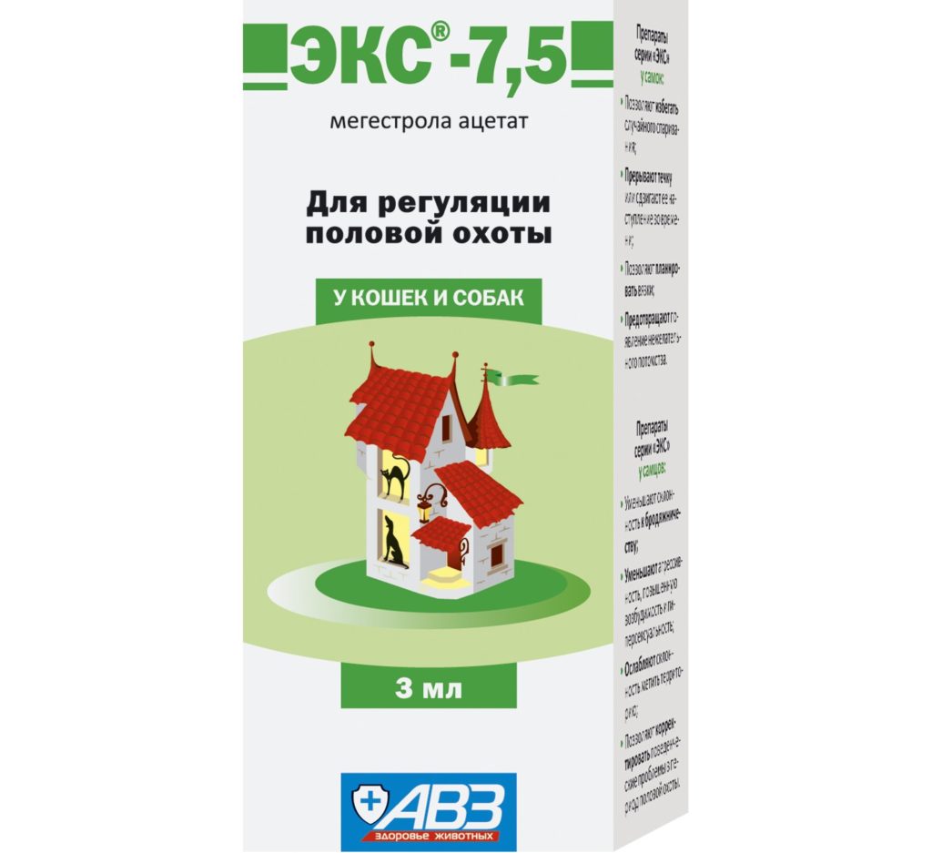 - ЭКС. Таблетки и суспензии на основе мегестрола ацетата. Курс приема препарата составляет от 2 до 4 недель в зависимости от выбранных дозировок и лекарственной формы. В любом случае терапию начинают заблаговременно, пока эструс еще не начался, а питомица находится в стадии полового покоя.