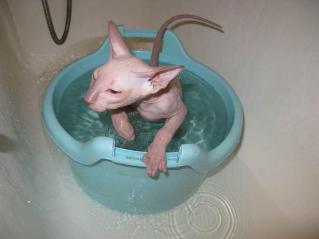 Ванные процедуры проводят немного чаще, чем у других пород. Оптимально купать кошку раз в 3-4 недели с применением специализированных шампуней для сфинксов (ph-нейтральные). Температура воды должна быть в пределах 38-40 градусов тепла, чтобы питомцу было комфортно и не холодно. После процедуры кошку заворачивают в махровое полотенце, чтобы излишки воды хорошо впитались в ткань.