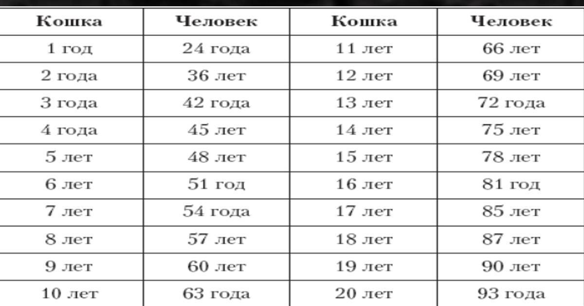 Чтобы понять соотношение кошачьего и человечьего возраста, были разработаны специальные таблицы. За свою жизнь, животное проходит несколько этапов развития. Они сменяют друг друга стремительно, значительно быстрее, чем у человека: