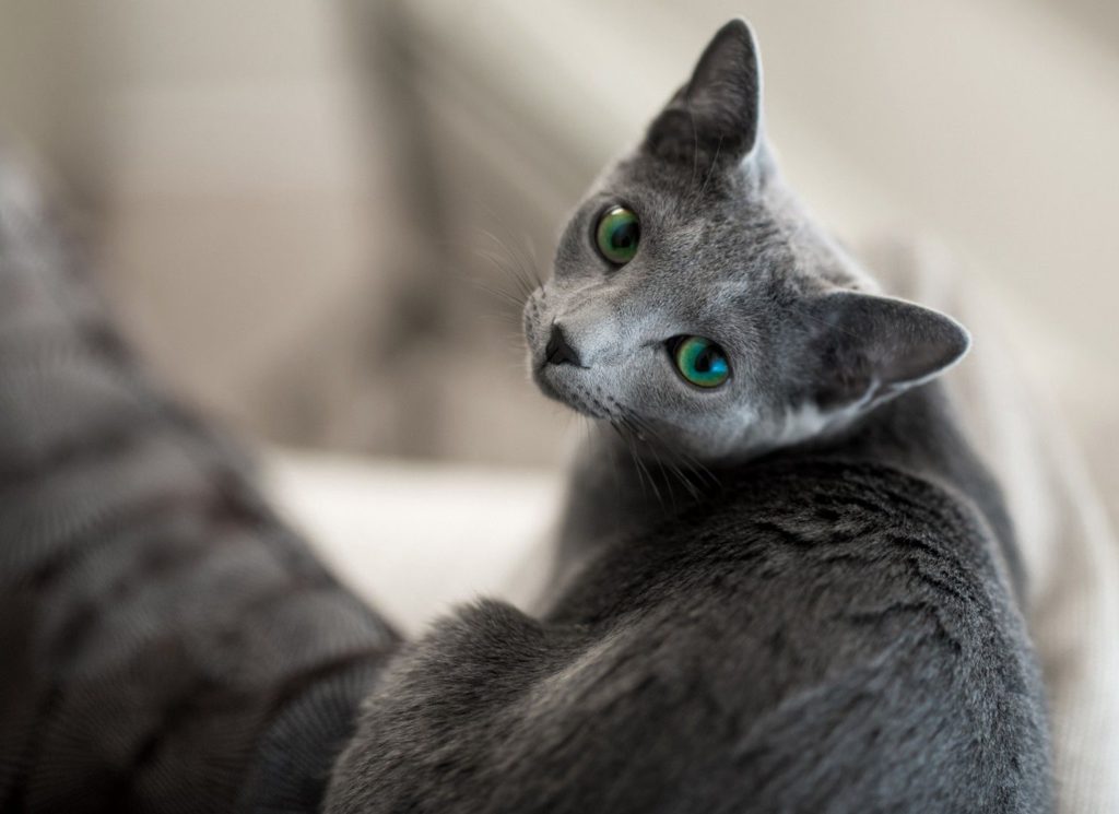 Русская голубая кошка. У этих животных гладкий и мягкий шерстный покров с серебристым отливом, подшерсток и остевой волос одинаковой длины. Одним из достоинств этих питомцев является малозаметная линька.