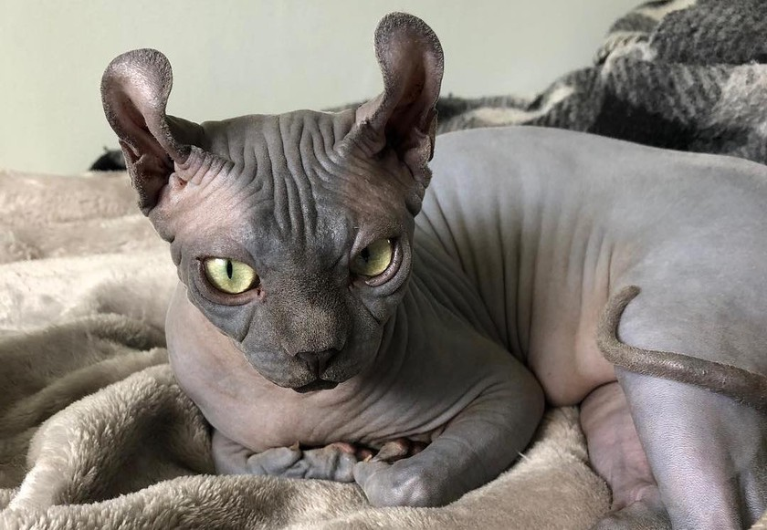 Отсутствие шерсти делает заметными все складки на коже. На ощупь кожный покров гладкий, с мелкими вкраплениями, как кашемировая ткань. Эталон допускает наличие шерстного покрова на верхушках ушей, хвосте и у основания лап. Окрас кожи имеет преимущественно серый или бежевый оттенок. Есть экземпляры с абсолютно белой или черной кожей.