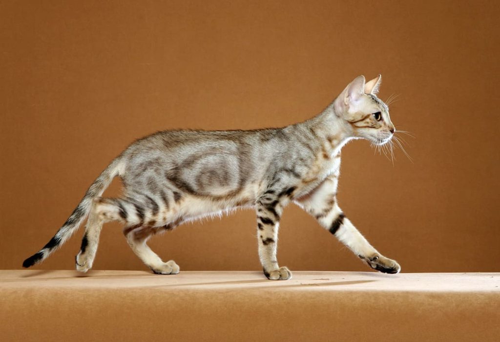 Это животное крепкие, толстохвостые и среднего размера. Его задние лапы особенно сильны, что позволяет ему прыгать на большую высоту и легко держаться. Что касается головы, то для бенгальской кошки характерны маленькие округлые уши, усы и ярко выраженный подбородок, сильные и широкие челюсти и зеленовато-желтые глаза.