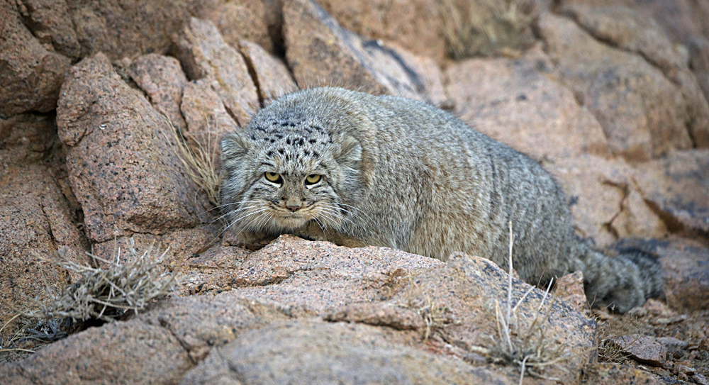 Среди диких кошек брахицефалия свойственная только манулам – котам-охотникам родом из Центральной Азии. Это животное размером с домашнего кота, обладающее массивным, приземистым телом и густой шерстью полосатого окраса (необходимо для маскировки). Плоская формы морды помогает манулу успешно охотиться и переносить добычу: приплюснутая форма головы позволяют зверю дышать с тушей в зубах, а более сильные челюсти – крепче ее удерживать.