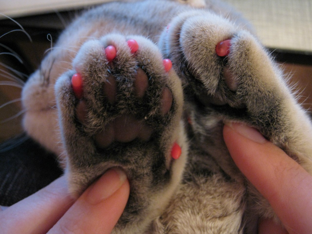 Чтобы их надеть, необходимо аккуратно нажать на кошачий палец и выпустить коготок. Покрыть специальным клеем, надевают сверху колпачок.