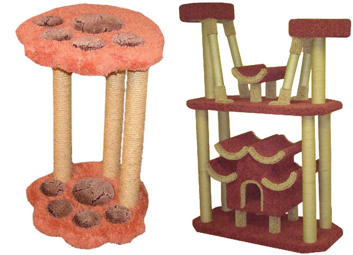Напольные. Они делятся на объемные и плоские. Плоские по виду напоминают обычную досочку разнообразных форм. Они устанавливаются на ровную гладкую поверхность, а питомец дерет когти об нее, словно о ковер или стену. Объемные точилки выглядят как столбики, закрепленные у широкого основания.