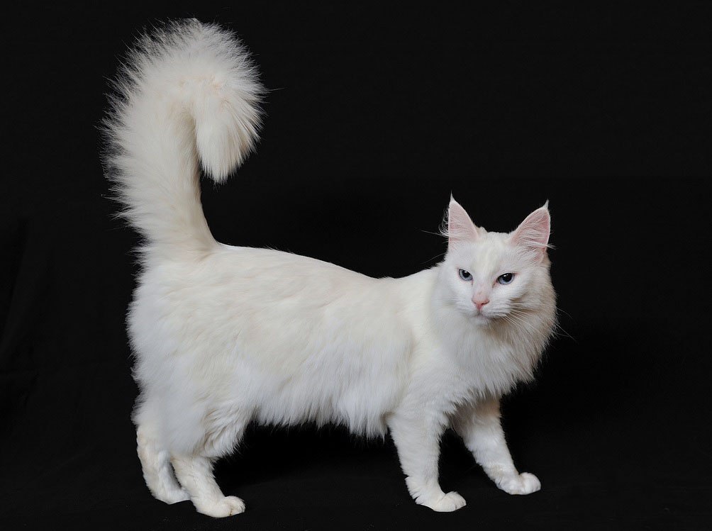 Классическая турецкая ангора – белая кошка. И именно этот окрас остается приоритетным. Ангоры — пропорцонально сложены, очень грациозны, прыгучи. У них может быть разный цвет глаз: зеленый и голубой. К сожалению, у таких животных проблемы со слухом – они глухи со стороны голубого глаза. Несомненным украшением служит пушистый хвостяра, напоминающий страусиное перо.