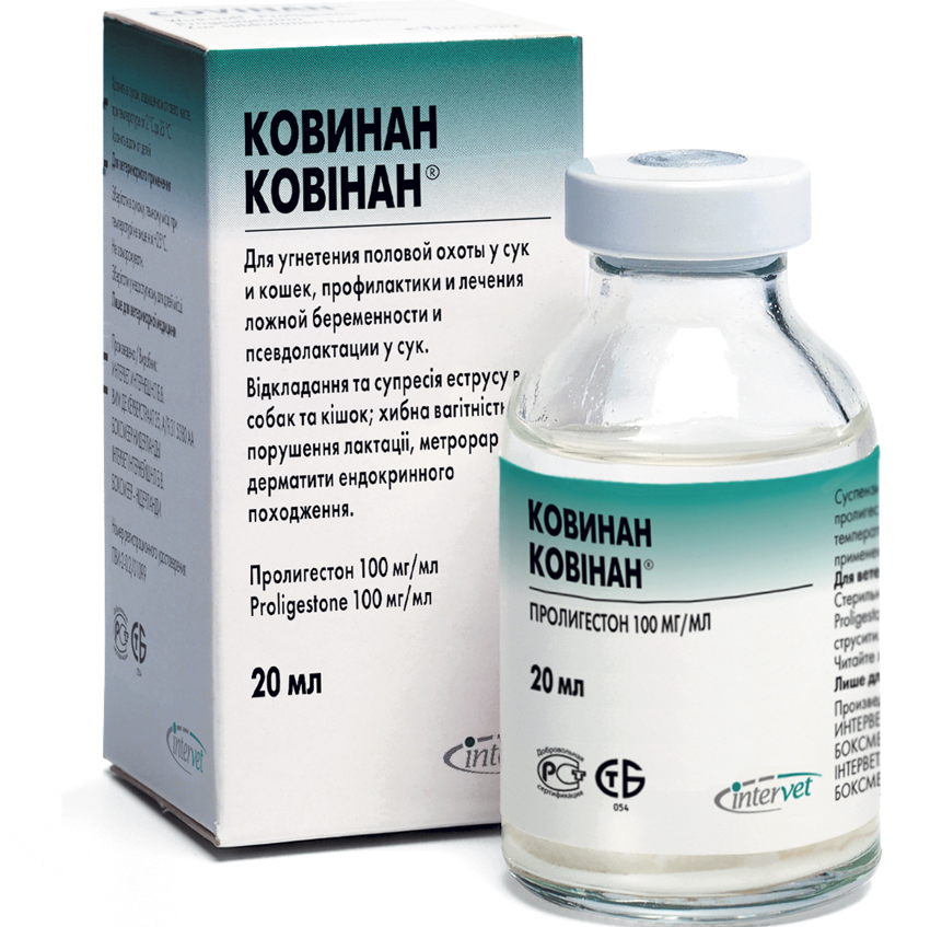 Использование пролигестона изменяет порядок сложных взаимодействий половых гормонов, в результате останавливается процесс созревания фолликулов яичников. Течка не наступает. Если произошла случайная вязка, Ковинан применяют для срыва нежелательной беременности. Маточные железы секретируют слизь повышенной густоты, что препятствует прикреплению к стенке уретры оплодотворенной яйцеклетки. Поскольку гормон имеет стероидную структуру, он аккумулируется жировой тканью подкожной клетчатки, а также печени, и оказывает угнетающее действие на эстрогены в течение 3–5 месяцев.