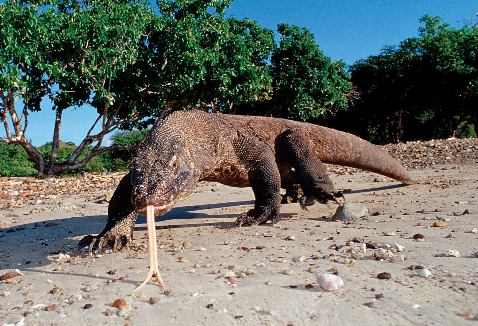 Комодского варана можно встретить на индонезийский островах: Гили-Мотанг, Комодо, Флорес, Ринч. Жители острова называют его наземным крокодилом. Факты говорят о том, что варан появился более 40 миллионов лет назад в Азии, затем и в Австралии. А 15 миллионов лет назад был обнаружен на острове Тимор, между Австралией и Юго-Западом Азии. Варан живет в хорошо прогреваемой солнцем местности, например, в тропических лесах, засушенных равнинах, в саваннах. В жаркий период, находится у сухих русел реки, охотиться в воде, и является отличным пловцом. Окрас комодского варана темно-бурый с мелкими желтыми пятнами по телу. На шкуре небольшие остеодермы (вторичное кожное окостенение). Зубы варана прижаты с боков, они имеют острые режущие края, что позволяет вскрывать крупную добычу. Так же, на лапах можно увидеть длинные когти, помогающие охотиться.