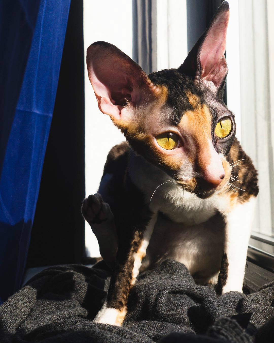 Трехцветная кошечка породы корниш-рекс