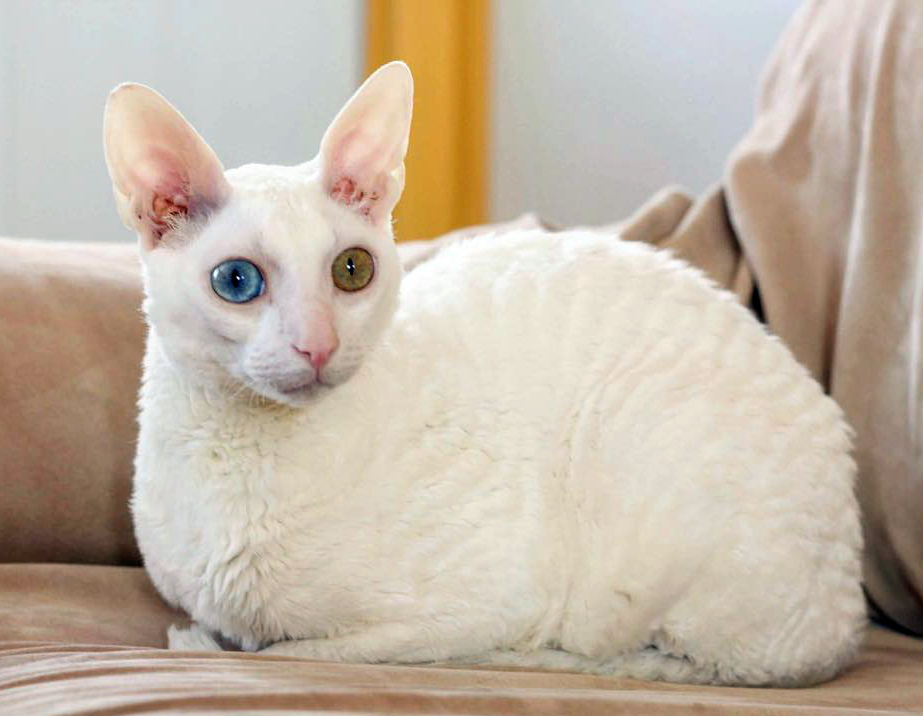 У корнишей белого окраса глаза могут быть как окрашенные, так и голубые. Крайне необычно выглядят питомцы с гетерохромией — глазами разного цвета.