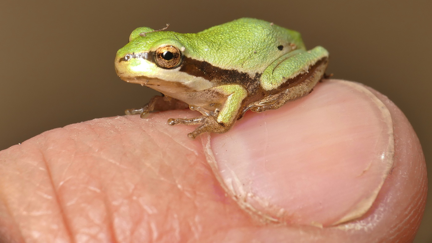 Поющий самец квакши с раздутым горловым мешком-резонатором