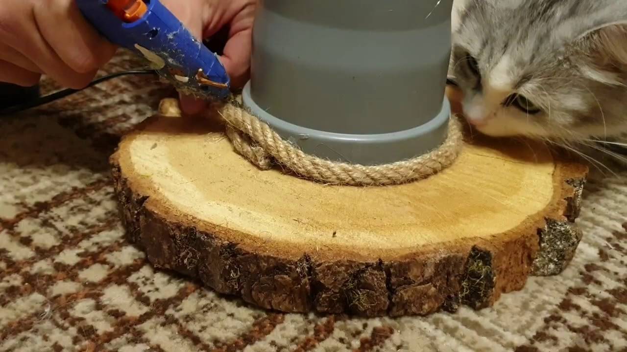 - Когтеточка своими руками. Просто обмотай ножки стула или табуретки тонкой веревкой, чтобы получить когтеточку.