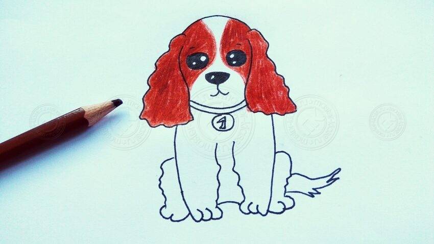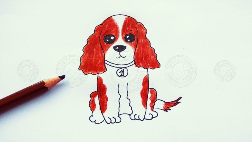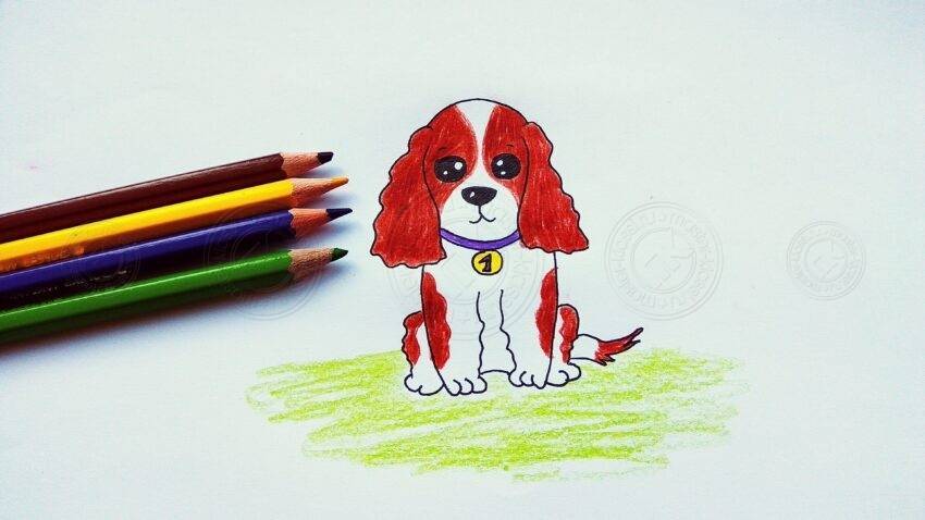 17. Напоследок, выделите ошейник любым цветом, например, фиолетовым, и разукрасьте медальку. Усадите спаниеля на лужайку. Для этого воспользуйтесь зеленым карандашом. И штрихами нанесите линии. Вот такая милая собачка у вас получается – замечательная и необычная.