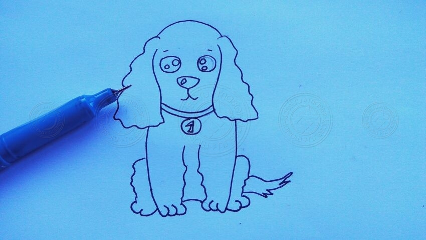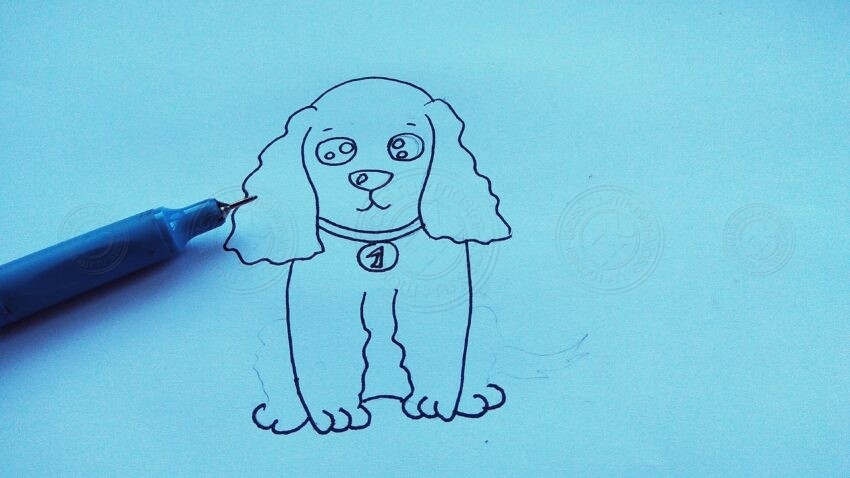 6. Нарисуйте и второе ухо, абсолютно такое же. Хотя если будет некоторая асимметрия, то это не навредит вашему рисунку. Под головой выведите 2 параллельные линии, выделяя ошейник. К нему примкните медальку. На медальке напишите единичку.