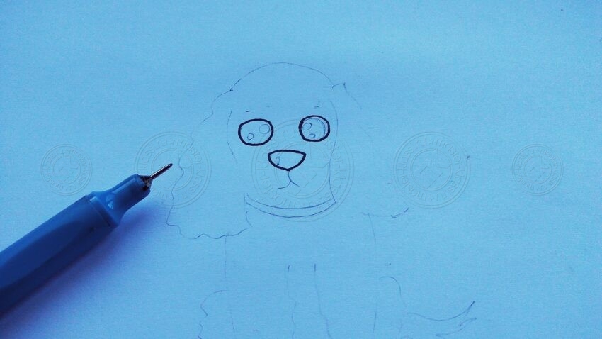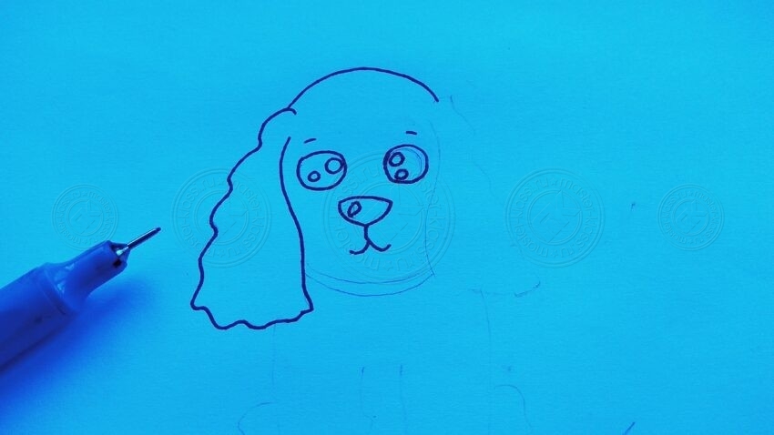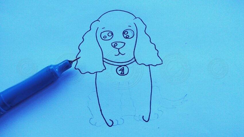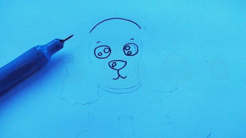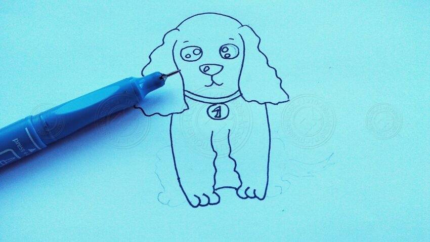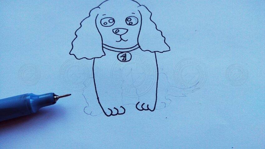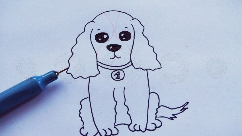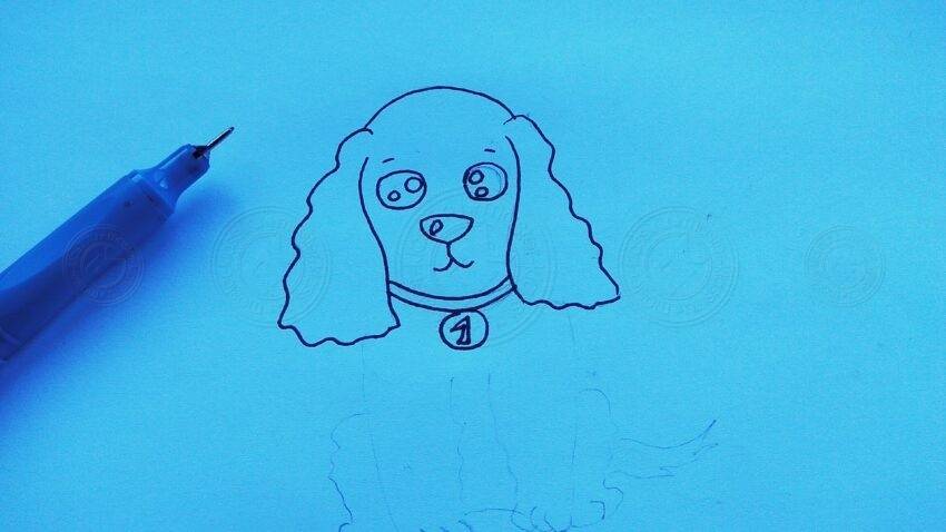 7. Продолжаем творческий урок. Голова спаниеля уже на листе. Опустите 2 линии вниз, примерно от центра ушей, показывая передние лапки. Внизу завете крючки. Это будут первые пальчики.
