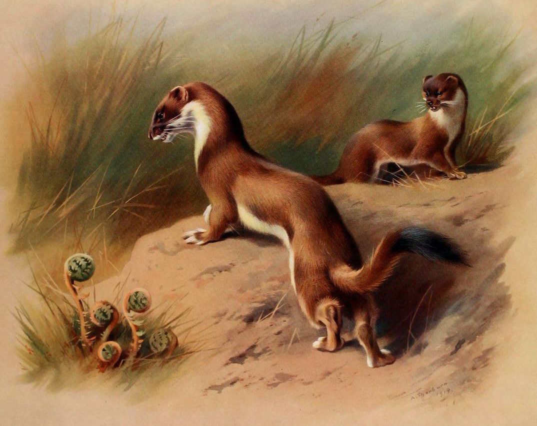 - Изящных миниатюрных хищниц многие живописцы стремились запечатлеть на своих полотнах. В частности, зверьки присутствуют на картинах Альфреда Вильяма Струтта, Арчибальда Торберна, анималиста Георгия Никольского.