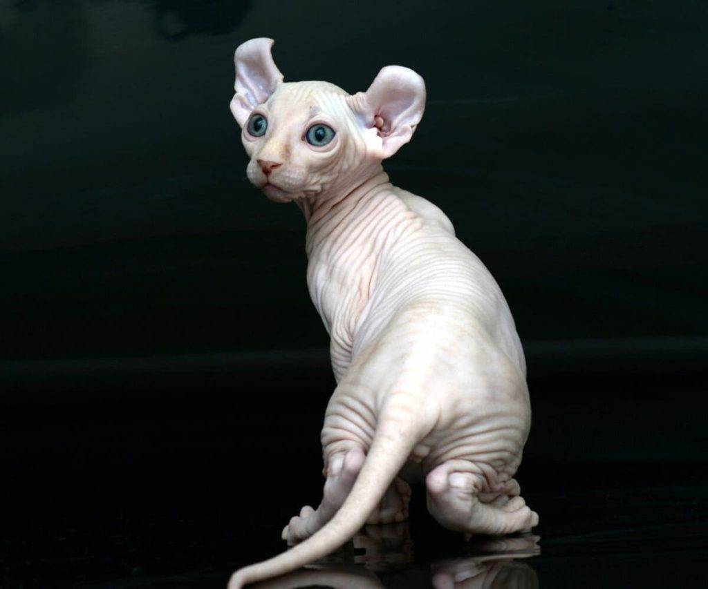 Молодая порода лысых котов привлекает внимание необычной формой ушек, миндалевидными глазами, гибким хвостом. Очень общительные, ласковые, готовые проводить с хозяевами каждую минуту