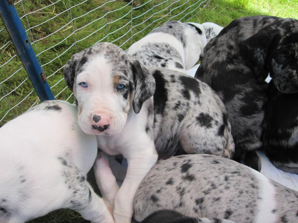 Леопард красный мерль Катахула с пометом, демонстрирующим широкий спектр окрасов шерсти, включая дабл-мерль