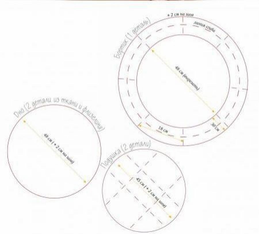 Вот пример круглой лежанки. На схеме указаны места боковин с наполнителем и места, куда нужно будет вставить ленту и затянуть (для достижения такого же эффекта, как на фото).