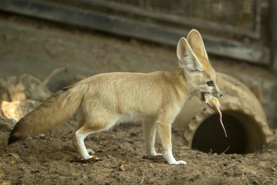 По сравнению с лисицами, фенек кажется крошечным созданием – взрослые особи достигают в холке высоты всего 18-22 см, а вес их не превышает 1,5 кг. Несмотря на такую миниатюрность, длина ушей у этой степной лисички довольно внушительная – 15 см, из-за чего выглядят фенеки очень забавно. Но такими большими ушами природа наградила этих зверьков не зря: во-первых, благодаря своим «локаторам», они прекрасно определяют местоположение своей добычи – мелких позвоночных и . А, во-вторых, уши фенека являются отличным источником терморегуляции, т.к