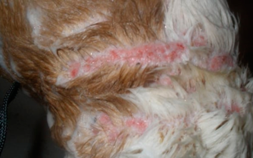 Первые признаки обычно малозаметны как для владельца, так и для собаки. Их можно заметить только на участках с редкой короткой шерстью и тонкой кожей (морда, уши, живот), в этих местах кожа краснеет и становится грубее.