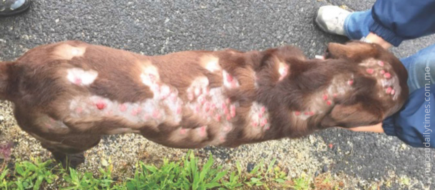 Пятна мокнущего лишая у собак проявляются в области поясницы, на щеках, хвосте, шее. Припухлости размером с 10-ти копеечную монету горячие, болезненные.