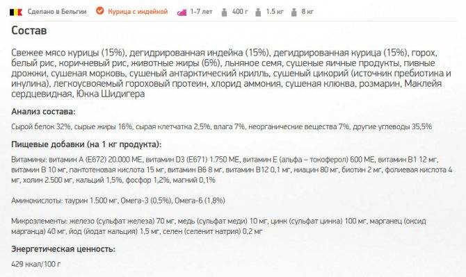 Кроме мясных компонентов далее по составу есть еще три богатых источника белка, это сушеные яичные продукты, сушенный арктический крилль и легкоусвояемый гороховый протеин. Но учитывая то, то последний почти в самом конце состава, его совсем мало. Отсюда можно сделать вывод, что основная час указанных в анализе 32% белка — животного происхождения.